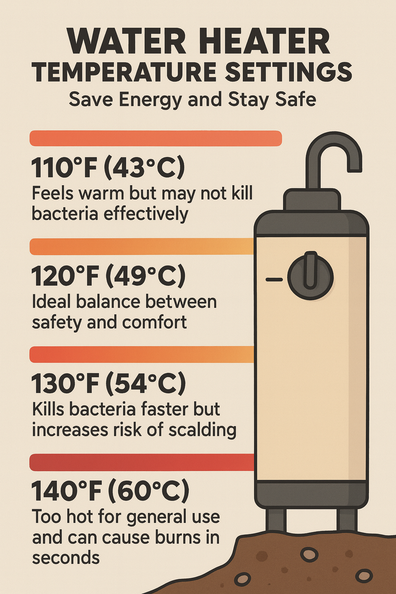 - 120°F (49°C): Ideal balance between safety and comfort